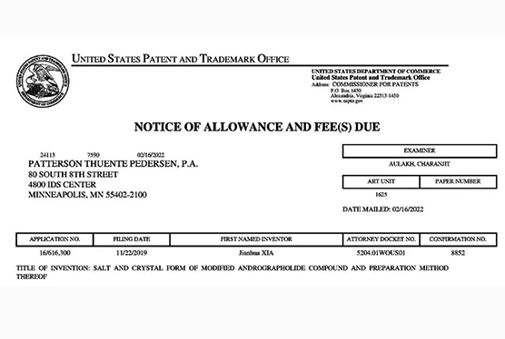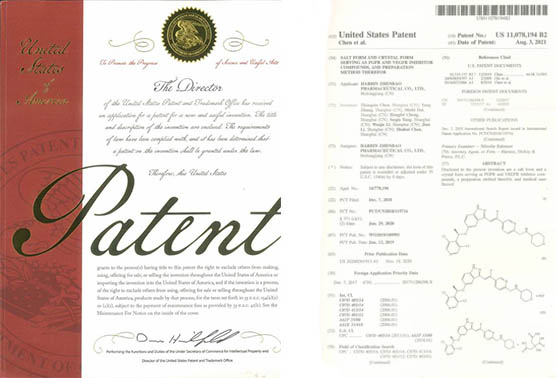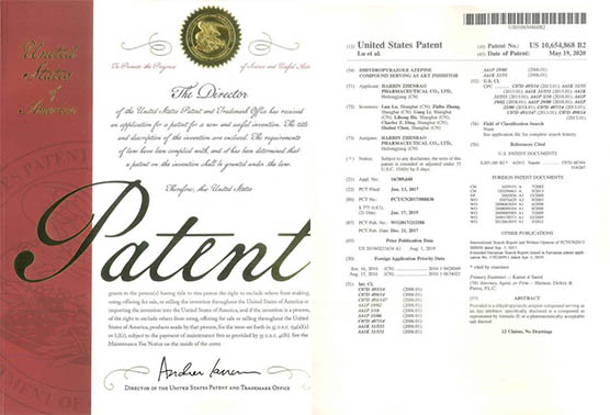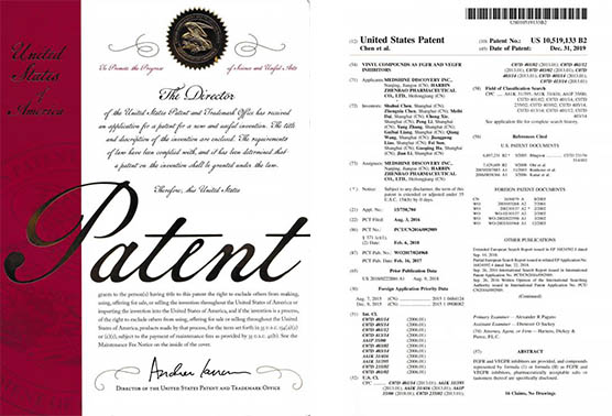 國內(nèi)發(fā)明專利通過PCT途徑,創(chuàng)新藥在多個國家獲得專利授權(quán),《作為FGFR和VEGFR抑制劑的乙烯基化合物》已獲得美國、歐洲、日本授權(quán);《作為Akt抑制劑的二氫吡唑氮雜卓類化合物》已獲得美國、歐洲、日本、韓國授權(quán);《作為Akt抑制劑的鹽型及其晶型》已獲得美國、日本、韓國和歐洲授權(quán);《穿心蓮內(nèi)酯改構(gòu)化合物》獲得美國授權(quán);《一種穿心蓮內(nèi)酯改構(gòu)化合物的鹽型、晶型及其制備方法》已獲得美國、歐洲授權(quán);《一種作為FGFR和VEGFR抑制劑化合物的鹽型、晶型及其制備方法》已獲得美國、歐洲、日本授權(quán)。